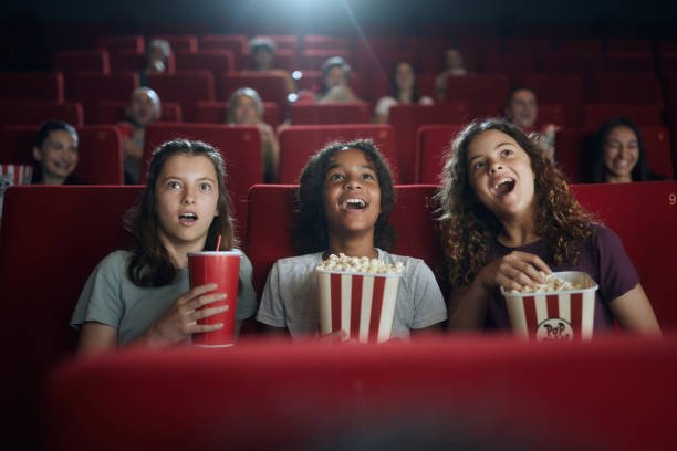 Group of surprised friends watching a movie in cinema.